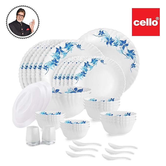 Cello Opalware Dazzle Series Blue Swirl Dinner Set, 37 Units | Opal Glass Dinner Set for 6 | Light-W